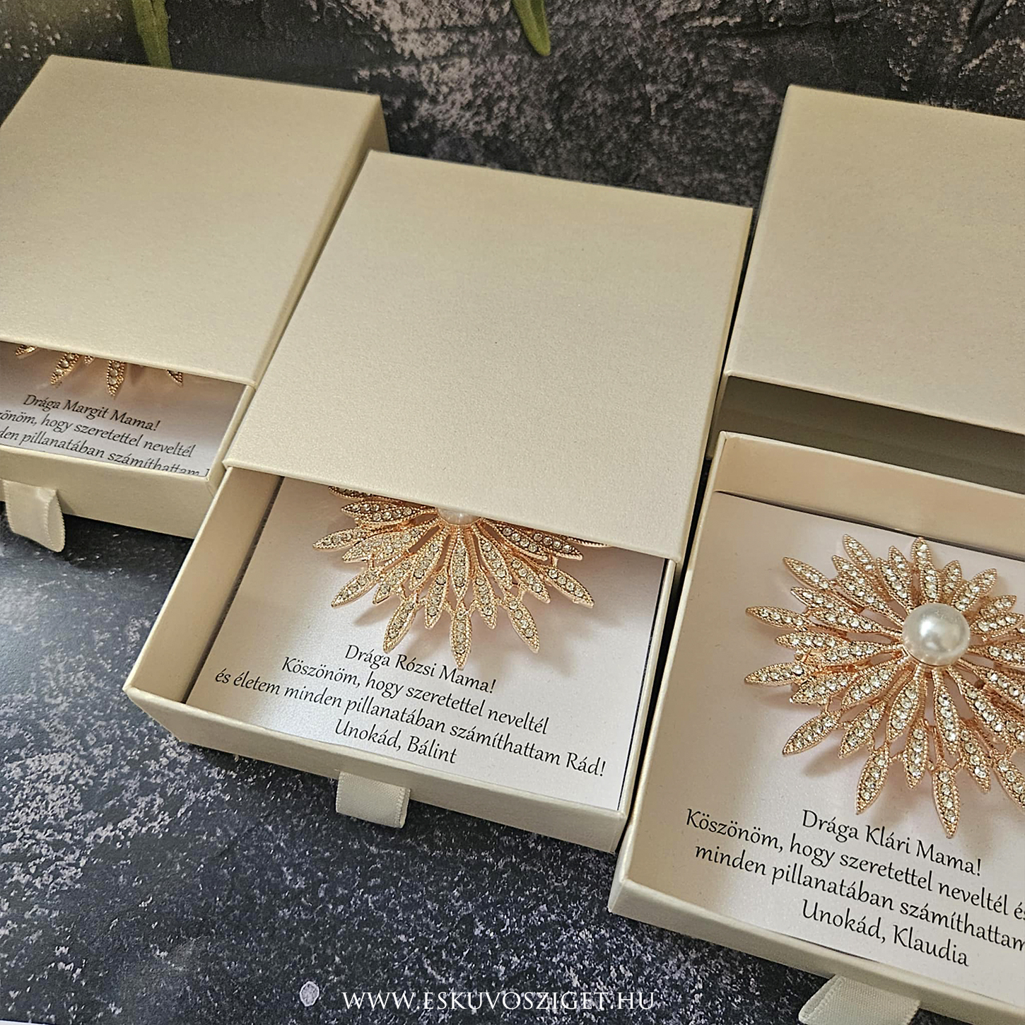 ÚJ! 2025-ös KOLLEKCIÓ! Bross kitűző kétféle színben, kihúzhatós, fiókos díszdobozban, egyedi szövegezéssel