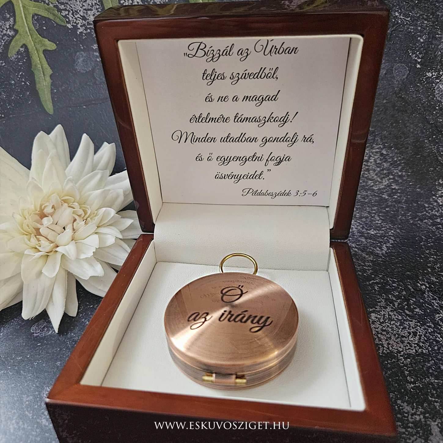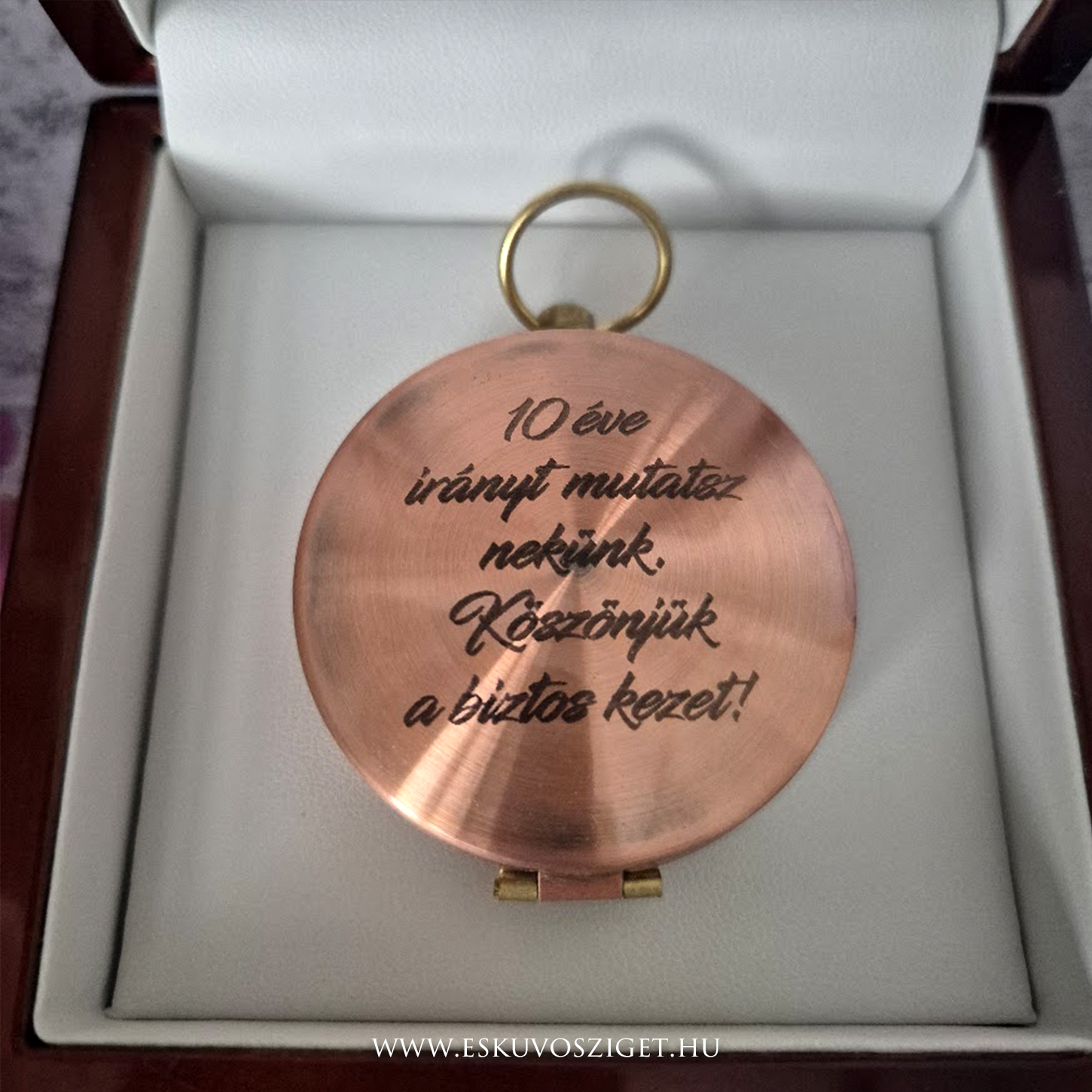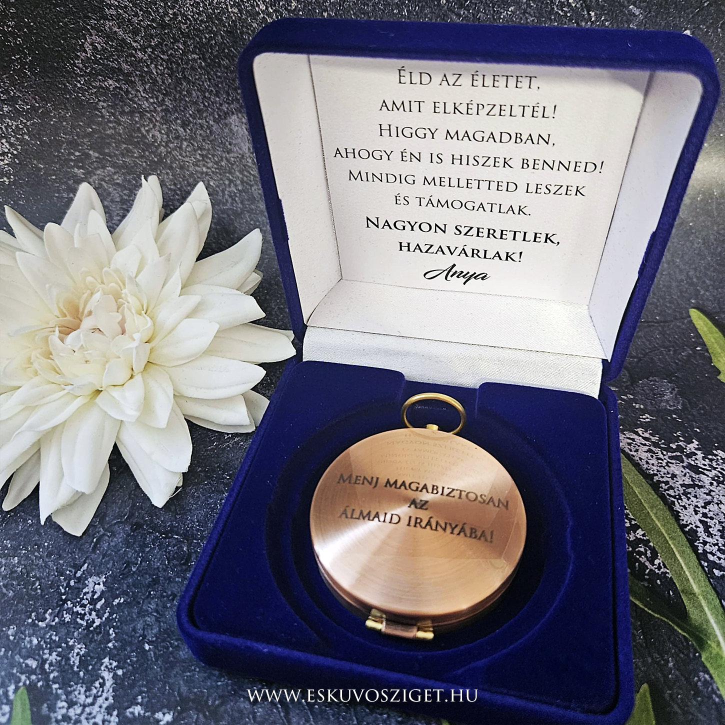 Rosegold árnyalatú, minőségi réz iránytű, ami gravírozható, ezáltal még személyesebbé tehető. A bársony vagy lakkozott, eko műbőr belsővel ellátott díszdobozaink is egyedileg feliratozhatók, személyes üzenet vagy egy szívélyes vallomás is kérhető rá.