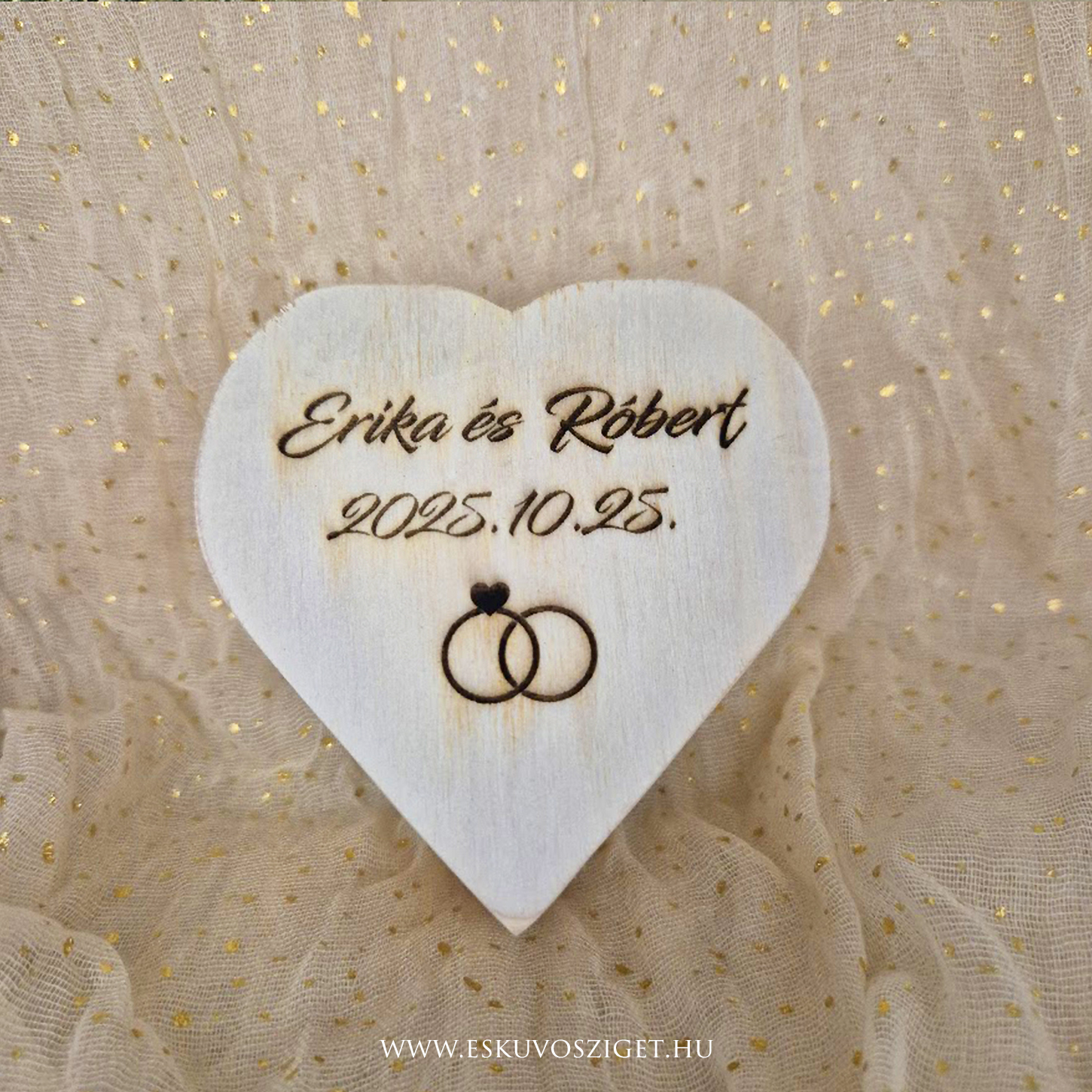Gyönyörű, gravírozott előlappal ellátott, szív alakú, natúr fa gyűrűtartó doboz, zöld növényzettel. A grafika változtatható, egyedire szabható.