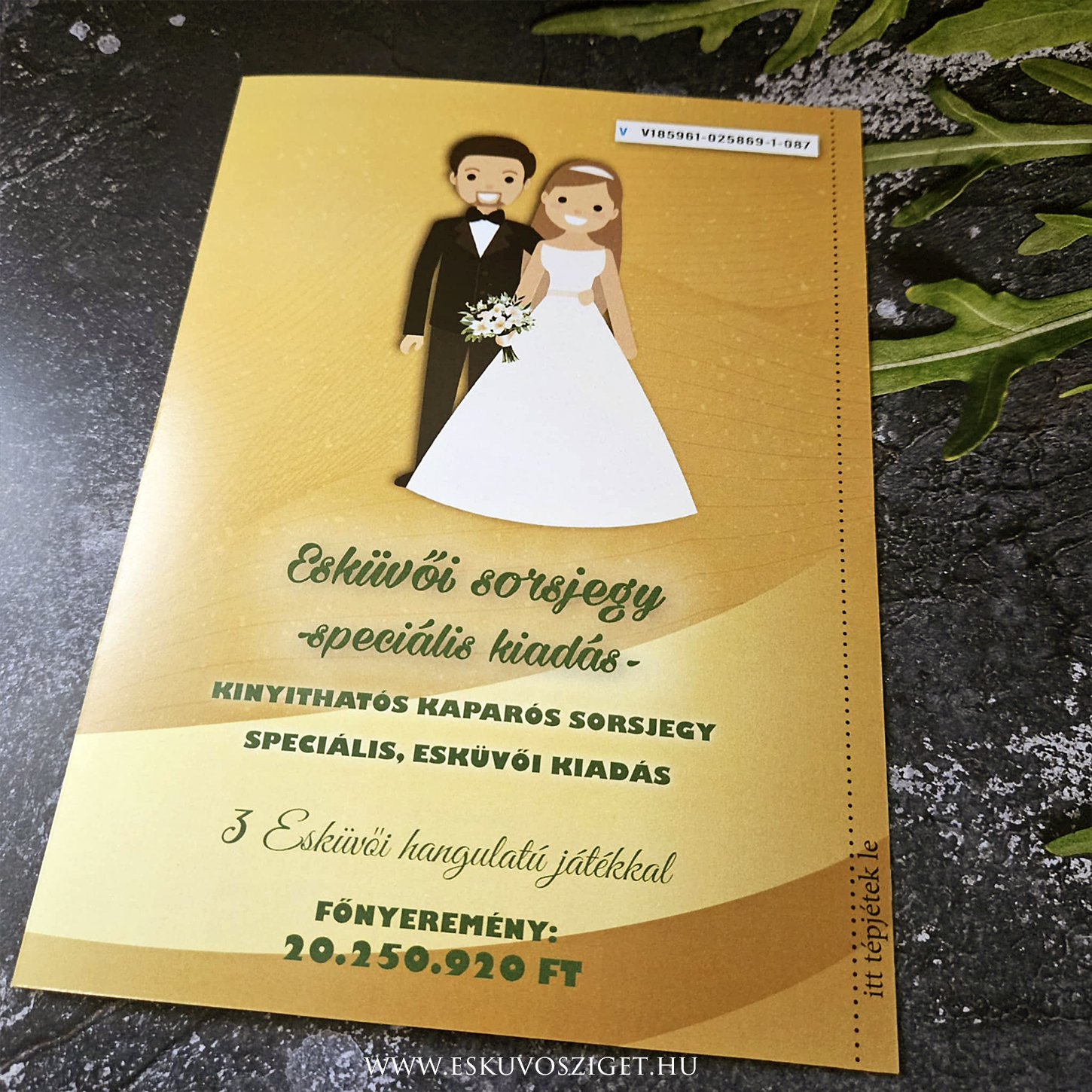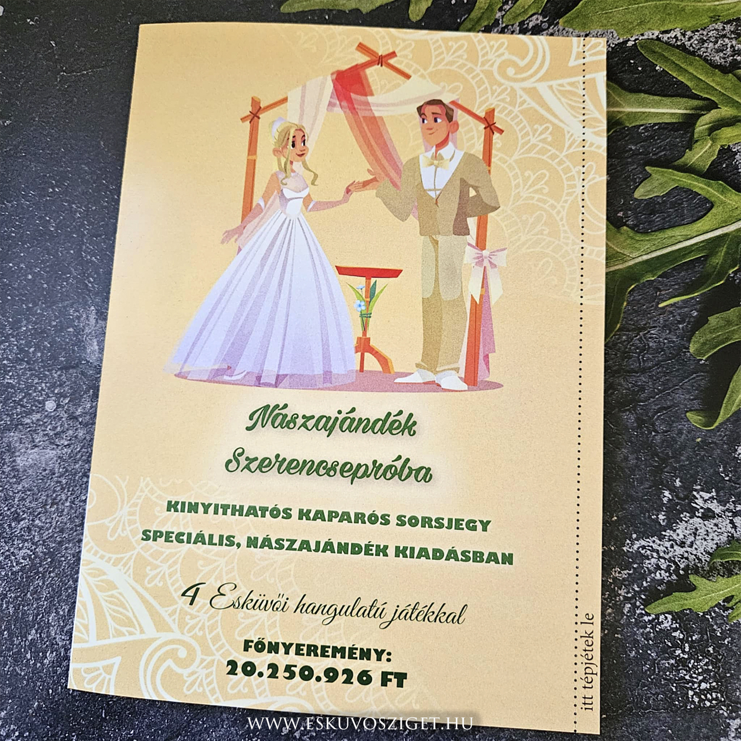 Nászajándékba pénzt, vagy a menyasszonytánci pénzt szeretnéd kreatívabb formában átadni? Itt a garantált meglepetés, amire senki sem számít! Egy sorsjegy, ahol mindent ( a játékokat, színeket, grafikát, feliratokat, stb.) mind-mind a párhoz igazítjuk a kéréseid szerint. Tehát egy teljesen rájuk szabott kaparós sorsjegyet kapnak, ami lehet névvel ellátott, de titokban hagyott is, kitől van...