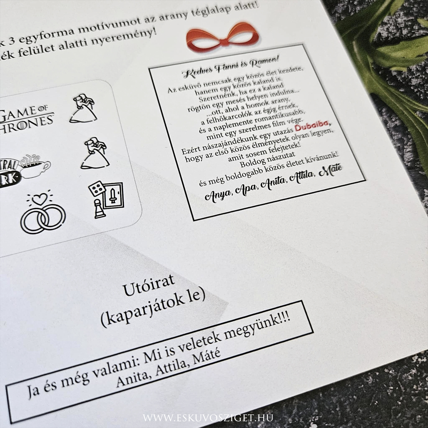 A perforáció mentél letéphető a széle (titkos zsebnél nem téphető le a szél!), így kinyithatóvá válik és előtűnnek a játékok. 3 vagy 4 féle esküvői hangulatú játék fér rá kényelmesen. Ez lehet dátum vagy számkereső, ikonok keresése, szöveg, felirat megtalálása feladatokkal. A játékok egyenként is lehetnek nyerősek vagy nem nyertesek, attól függ mennyire szeretnéd őket felcsigázni. Az utolsó játéknál a legvége biztosan nyertes lesz, hogy lekaparhassák és megkaphassák az általad megfogalmazott szöveget az ajándék motívum alatt és benne a nászajándék összegét is felfedheted. Ha eddig csak tapogatóztak, kitől jöhetett ez az ajándék, most feltárhatod. Örömapa, Örömanya ajándéka? Nagyszülőktől? Keresztszülőké? Tesó volt?...az biztos hogy el fognak érzékenyülni, egy ilyen személyes, izgalmas percekbe rejtett ajándéknak... Lepd meg őket egy felejthetetlen élménnyel és várd a hatást!