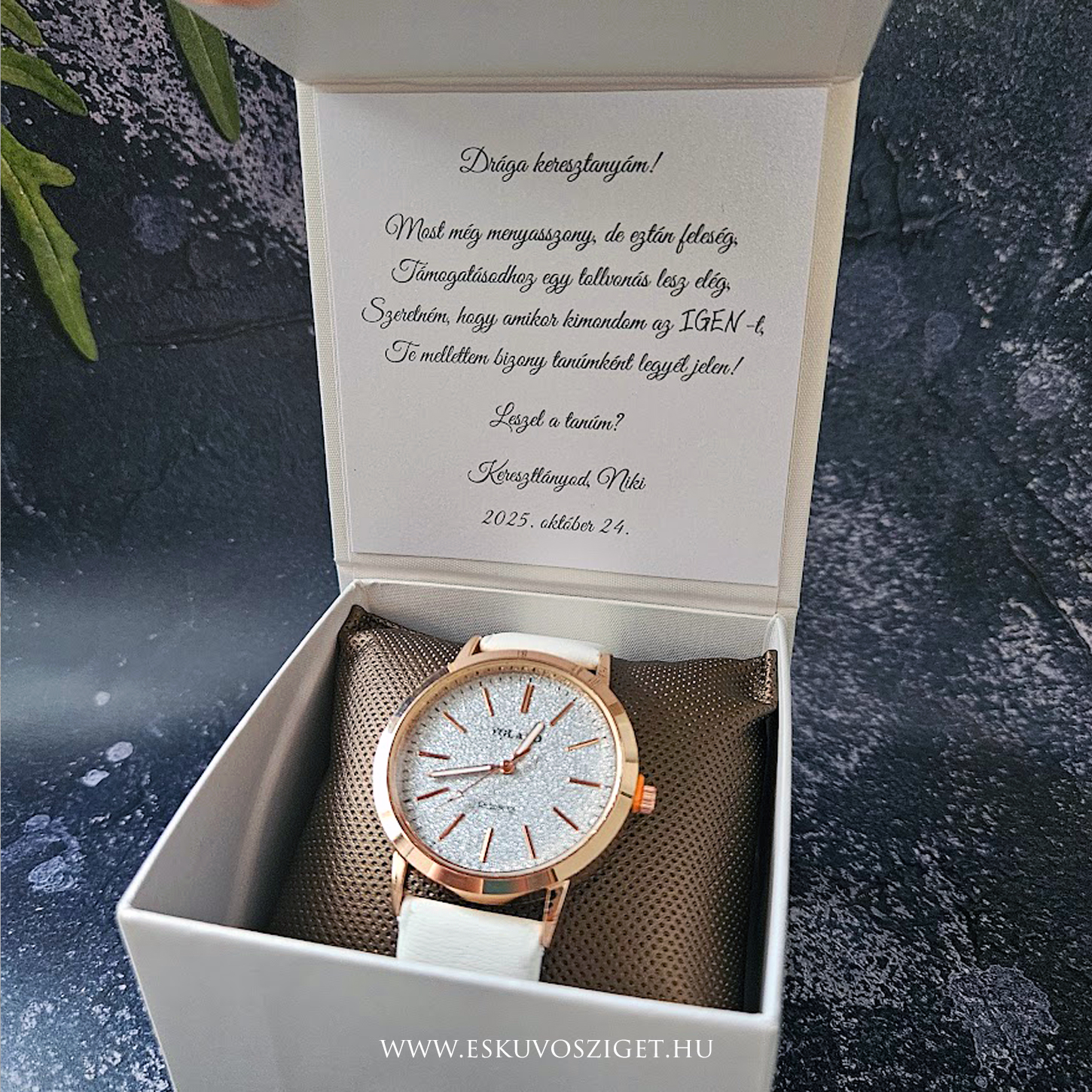 Divatos karóra, különleges, csillámos óralappal. Minden korosztálynak ideális, nem hivalkodó, de mégis klasszikus bájával minden szem rászegeződik. 3 féle színben, lásd a képek között! A dobozt kedved szerint feliratozhatod, lehet belőle örömanya ajándék, nagymama köszöntő, a szöveg módosításával szülinapi, anyák napi ajándék, vagy akár ballagásra, diplomaosztóra is kérheted. Szívesen készítjük bármilyen alkalomra! Írd meg megjegyzés rovatba, hogy milyen szöveggel kéred! Klasszikus bebújtatós csattal, hogy méretre állítható legyen bármilyen vastagságú csuklóhoz.