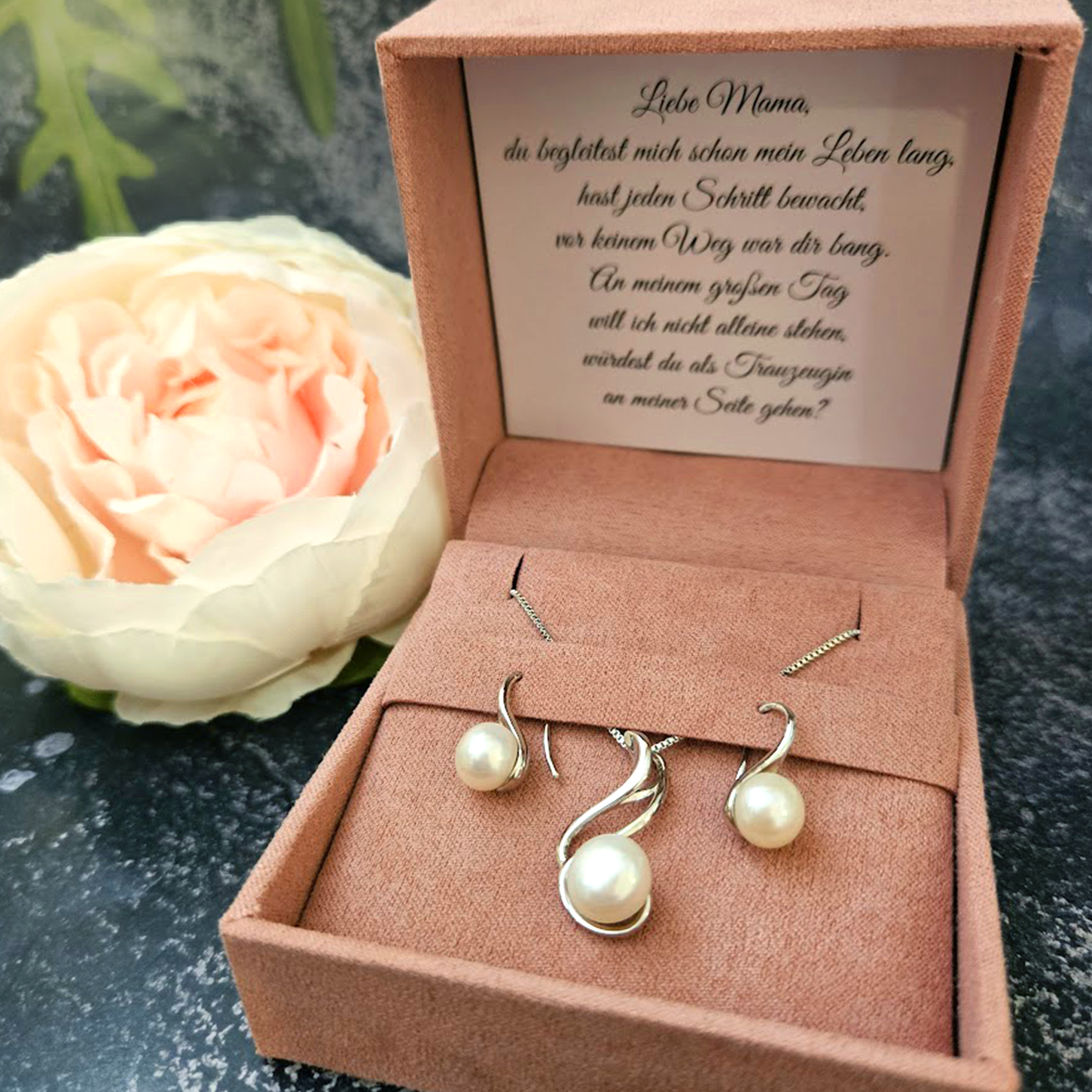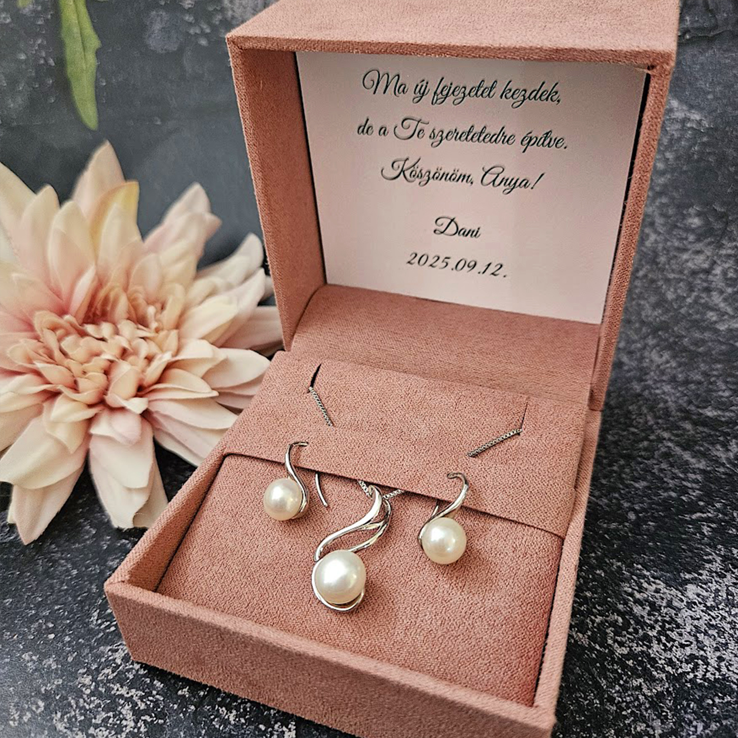Ez az elegáns gyöngy fülbevaló és nyaklánc szett a szeretet és tisztelet csodaszép kifejezése.