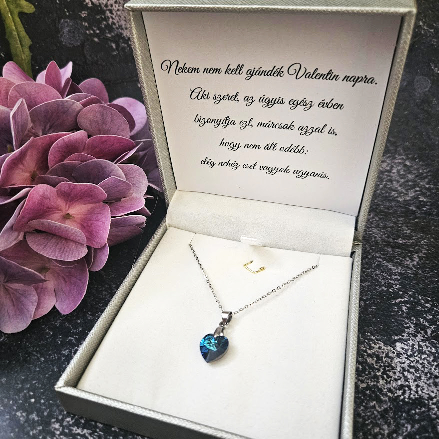 Csodaszép, szív alakú Swarovski®/Preciosa kristálymedál nyaklánc 9 féle színben, gyönyörű fehér, arany, vagy ezüst prémium minőségű dobozban, aminek a belsejében egyedi üzenet lapul. Hosszabb szövegek elhelyezésére is alkalmas, de akár lényegre törő egy két szó is bele kerülhet.