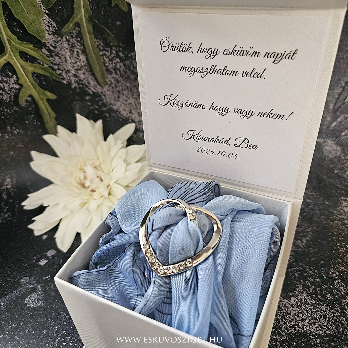Gyönyörű, szolid, chiffon anyagból készült légáteresztő, szőtt sálkendő, feliratozható díszdobozban. ÚJ! Kék színben is, így már 4 féle színben elérehtőek, melyek nem hivalkodóak, egyszerűen elegánsak. Bármilyen alkalomra! Finom tapintású, könnyedén illeszkedik bármely öltözékhez.