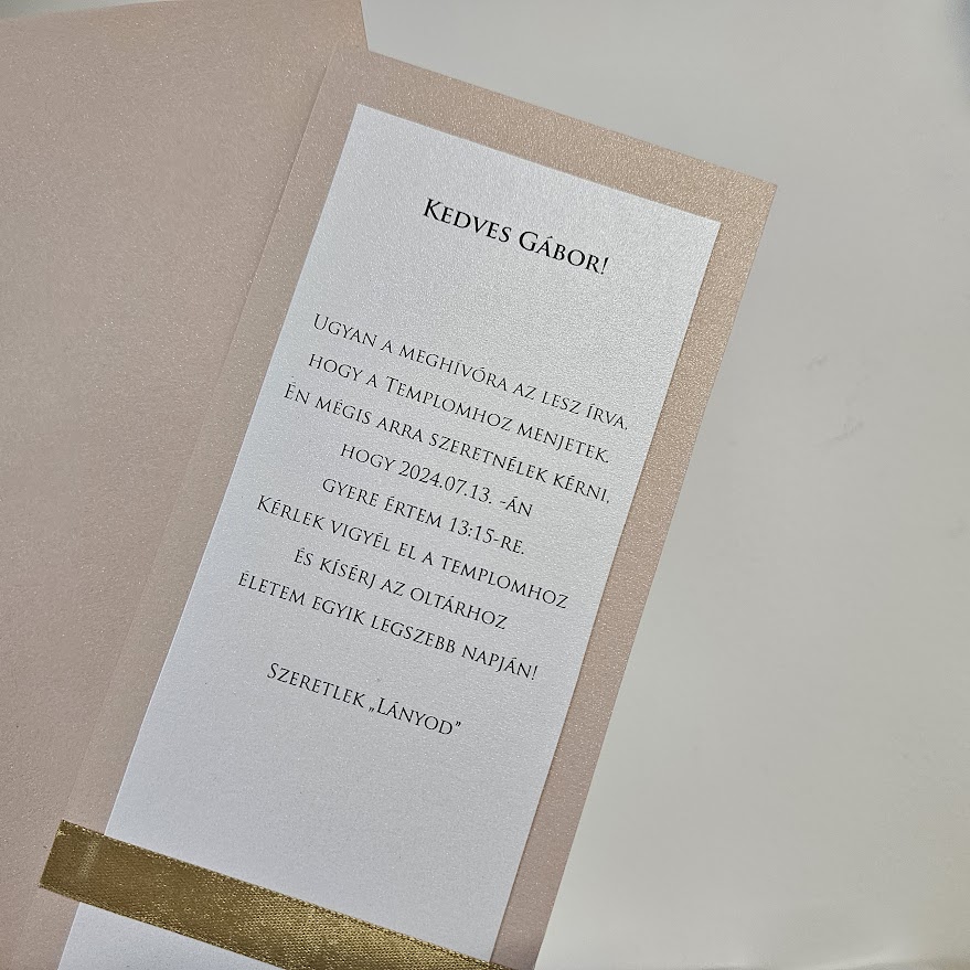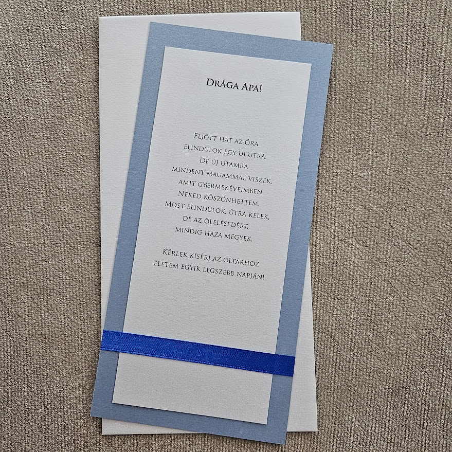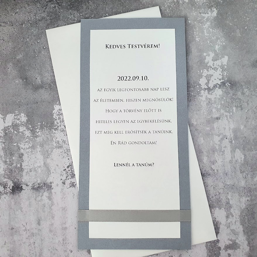 Elegáns, megható kártya, amellyel méltó módon kérheted fel életed fontos szereplőit a nagy napra. Több színben rendelhető, letisztult, ünnepi megjelenéssel. Különleges választás örömanya/örömapa felkéréshez, oltárhoz kísérés kéréséhez vagy tanúfelkérőnek.