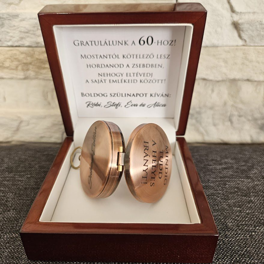 Rosegold árnyalatú, minőségi réz iránytű, ami gravírozható, ezáltal még személyesebbé tehető. A bársony vagy lakkozott, eko műbőr belsővel ellátott díszdobozaink is egyedileg feliratozhatók, személyes üzenet vagy egy szívélyes vallomás is kérhető rá.
