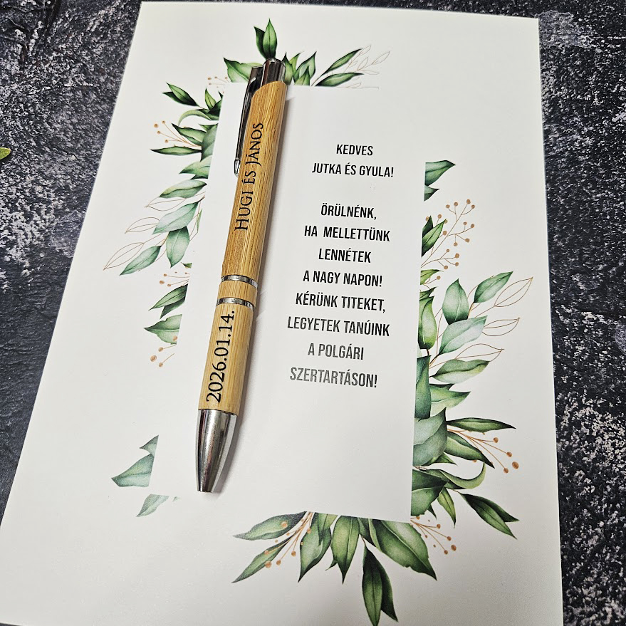 A lap szövegezése egyedire szabható, ahogyan a gravírozott felirat is. Gravírozás nélkül is kérhető. A toll a lapról könnyen leválasztható.