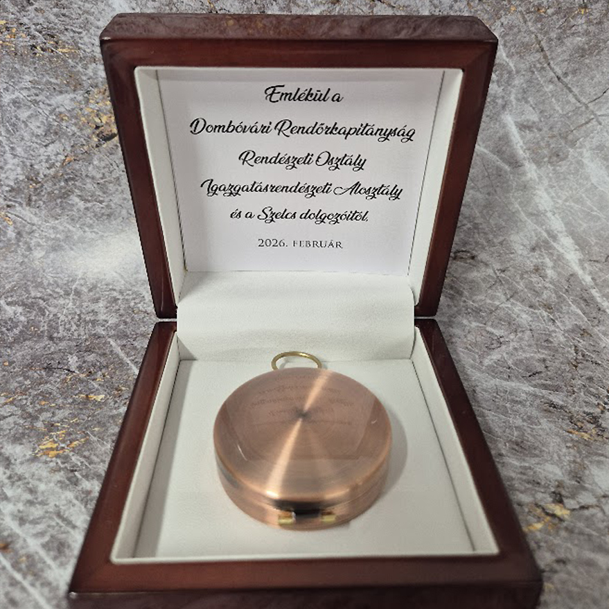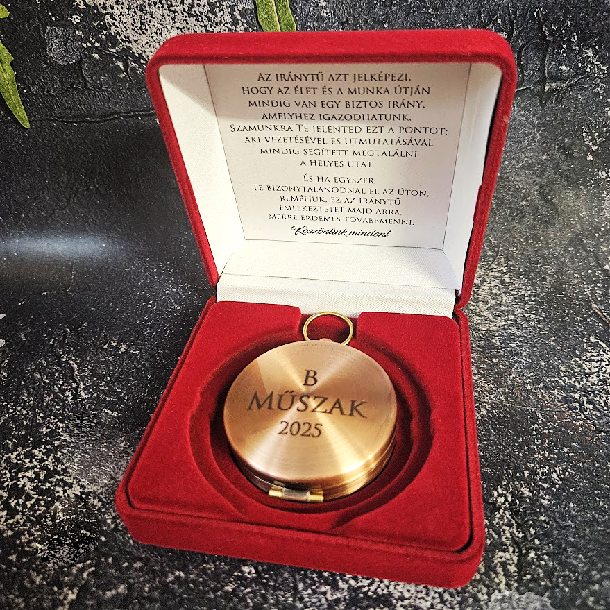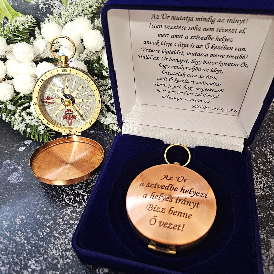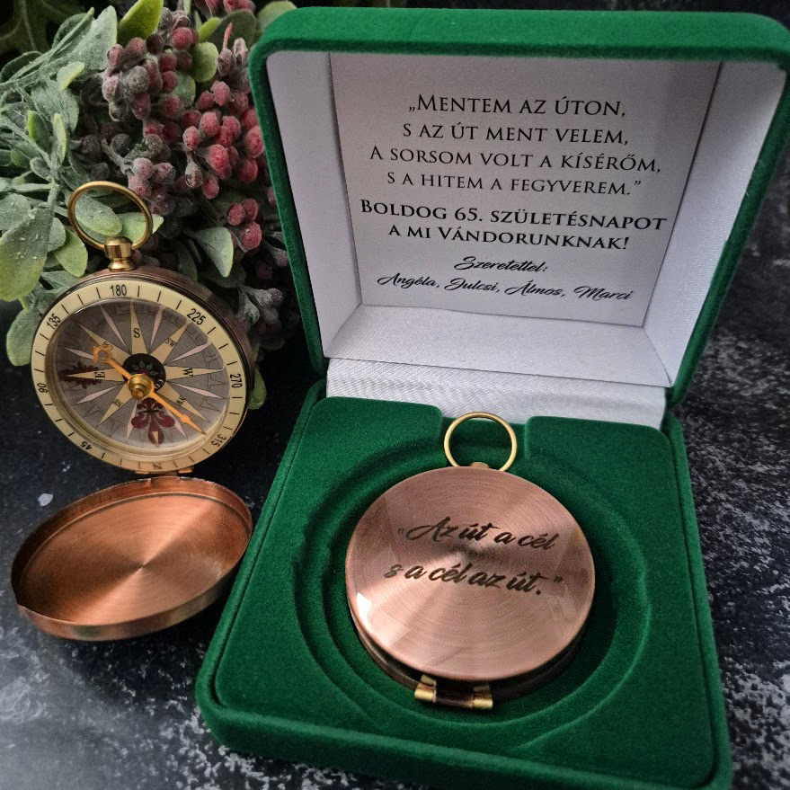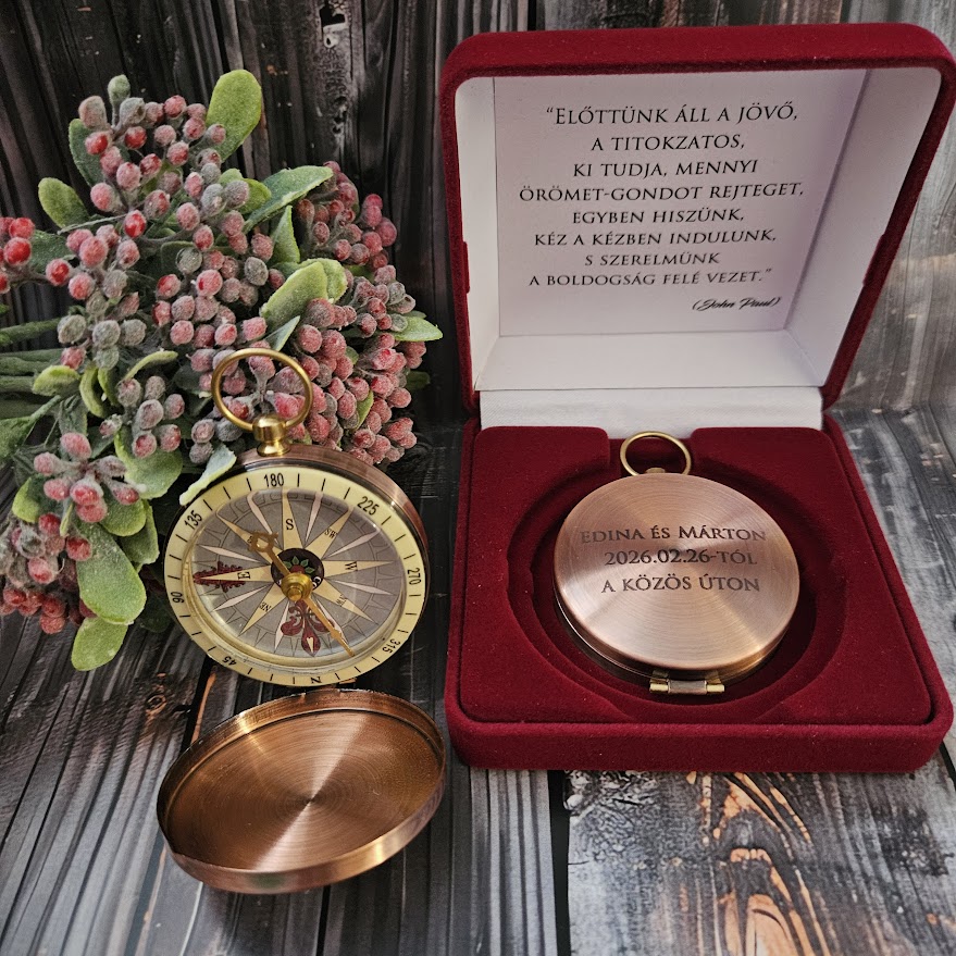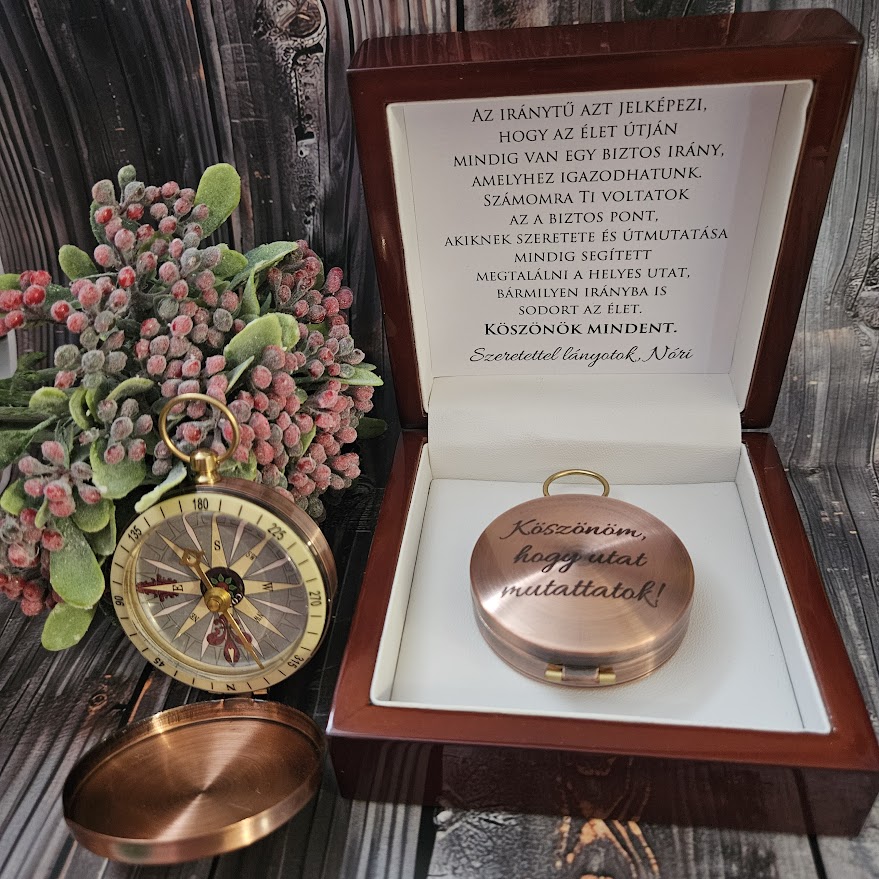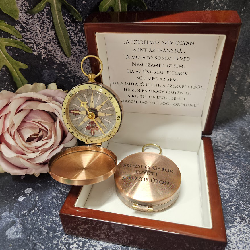 Rosegold árnyalatú, minőségi réz iránytű, ami gravírozható, ezáltal még személyesebbé tehető. A bársony vagy lakkozott, eko műbőr belsővel ellátott díszdobozaink is egyedileg feliratozhatók, személyes üzenet vagy egy szívélyes vallomás is kérhető rá.