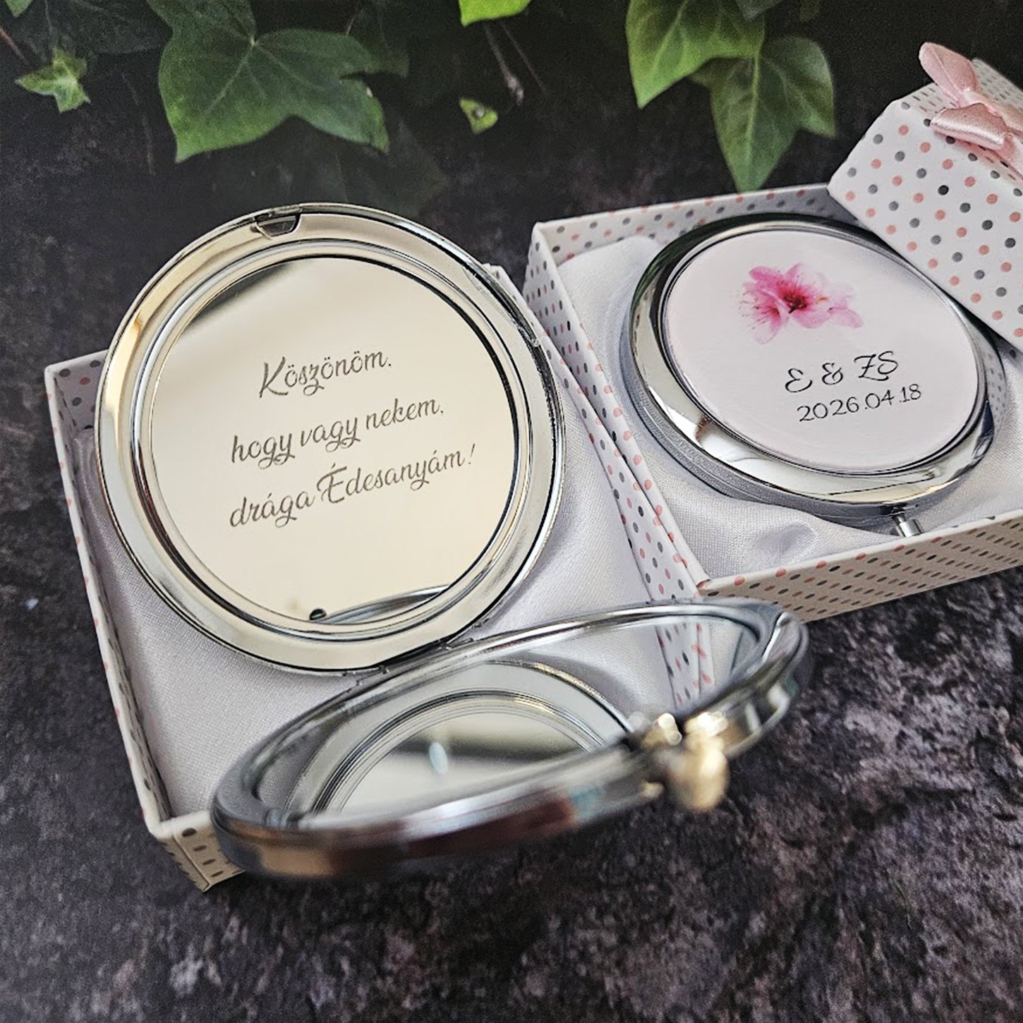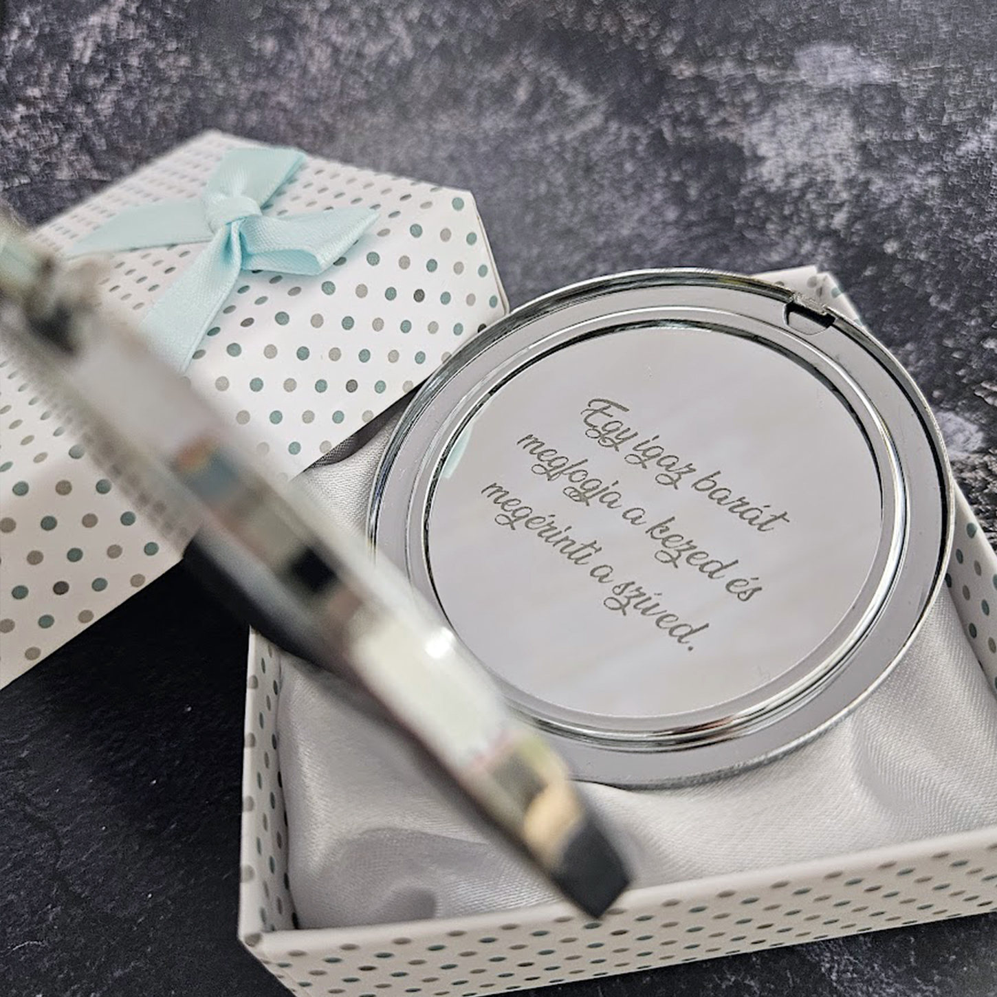 Ezüst színű zsebtükör, melynek belsejében gravírozást készítünk az általad megadott szöveggel.