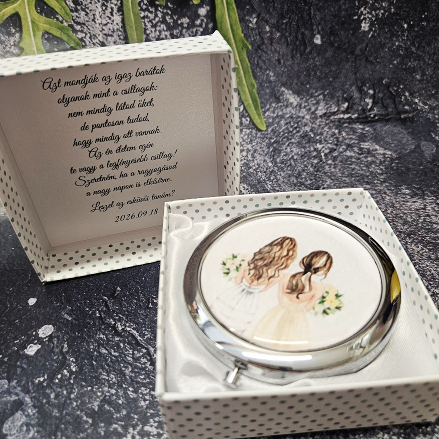 Lélegzetelállító sminktükör Édesanyádnak, Nagymamádnak, tesódnak esküvőd alkalmából vagy ajándék tanúdnak, koszorúslányodnak, de akár pl. keresztanya felkérőnek is használható. Ajánljuk ballagásra, diplomaosztóra, ha valami különleges ajándékot adnál át.