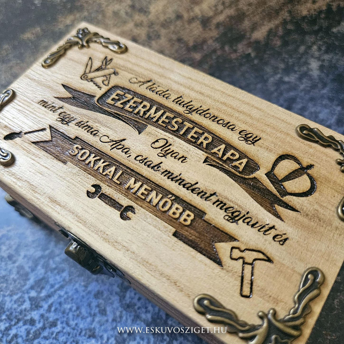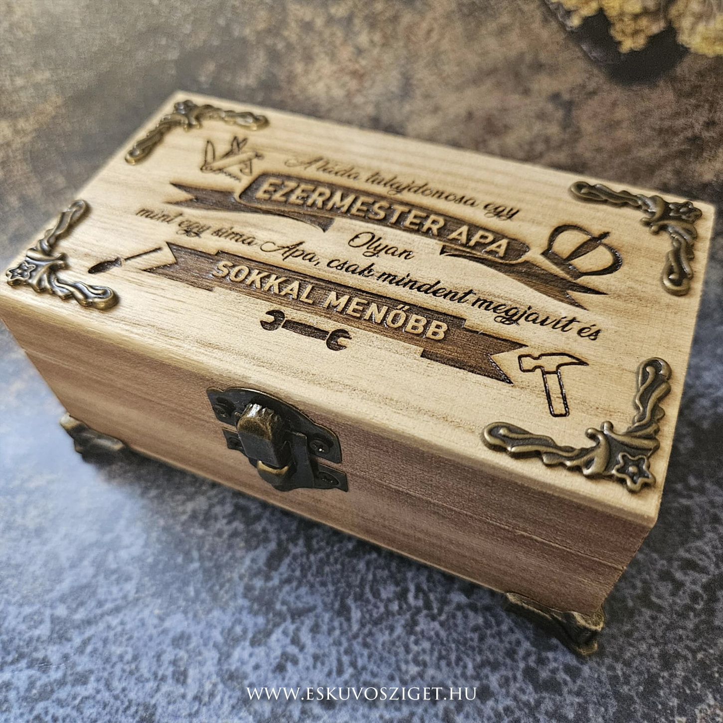 Gravírozhatsz bele nevet, dátumot, vagy egy Szeretlek feliratot, a díszdoboz tetejére akár egy hosszabb szöveget is. (pl. a képen).