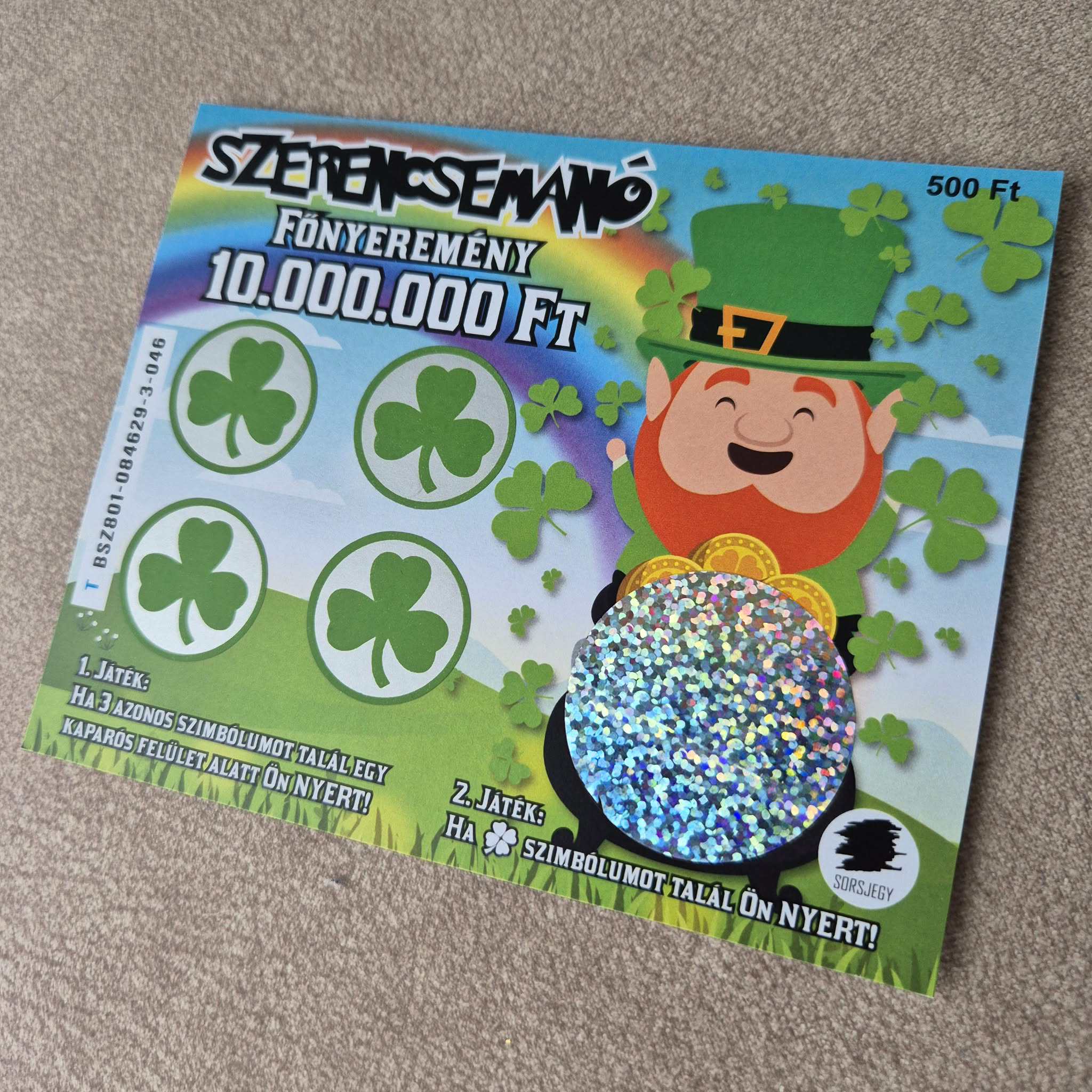 Szuper hihető, szerencsemanó kaparós sorsjegy, a szerencsét hozó Szent Patrik motívummal.