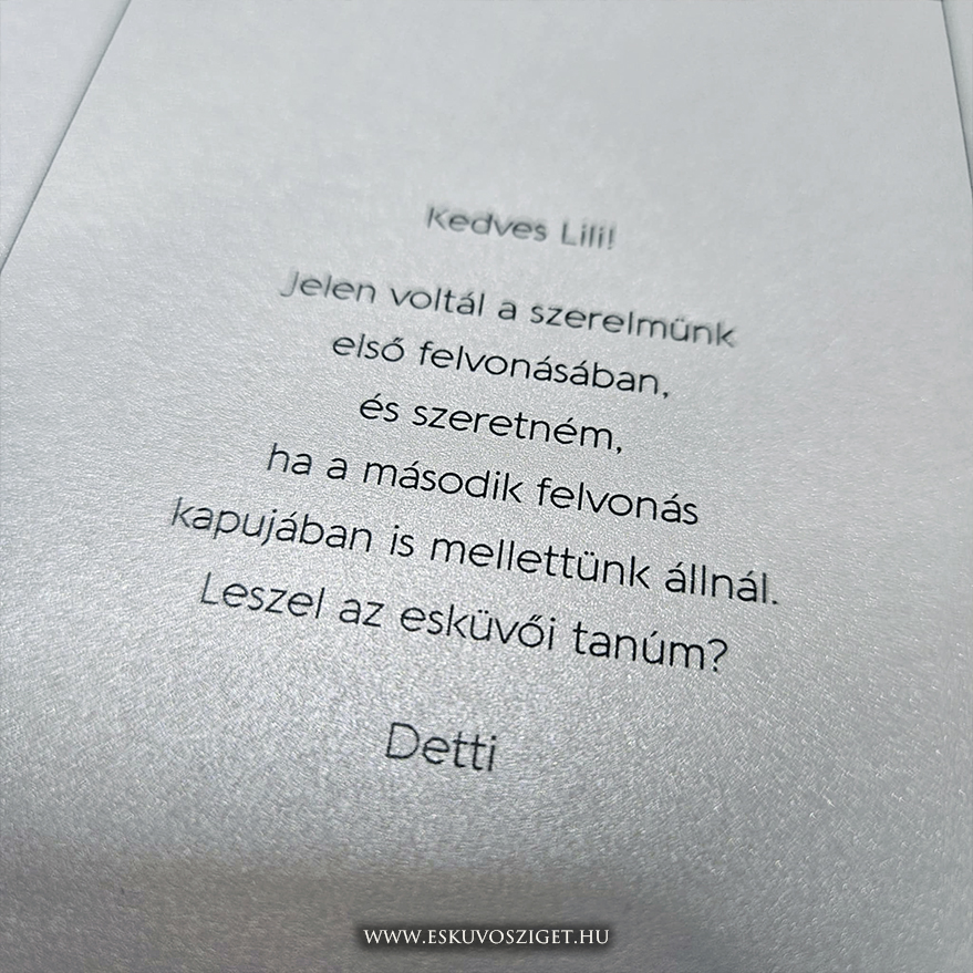 A perforáció mentén feltéphető előlap alatt rejtőzik a felkérendő szöveg. Akár más alkalmakra is átvariálható (kereszt szülő felkérés, szülinapra, névnapra). Férfiaknak és nőknek egyaránt! Papírtasakkal.